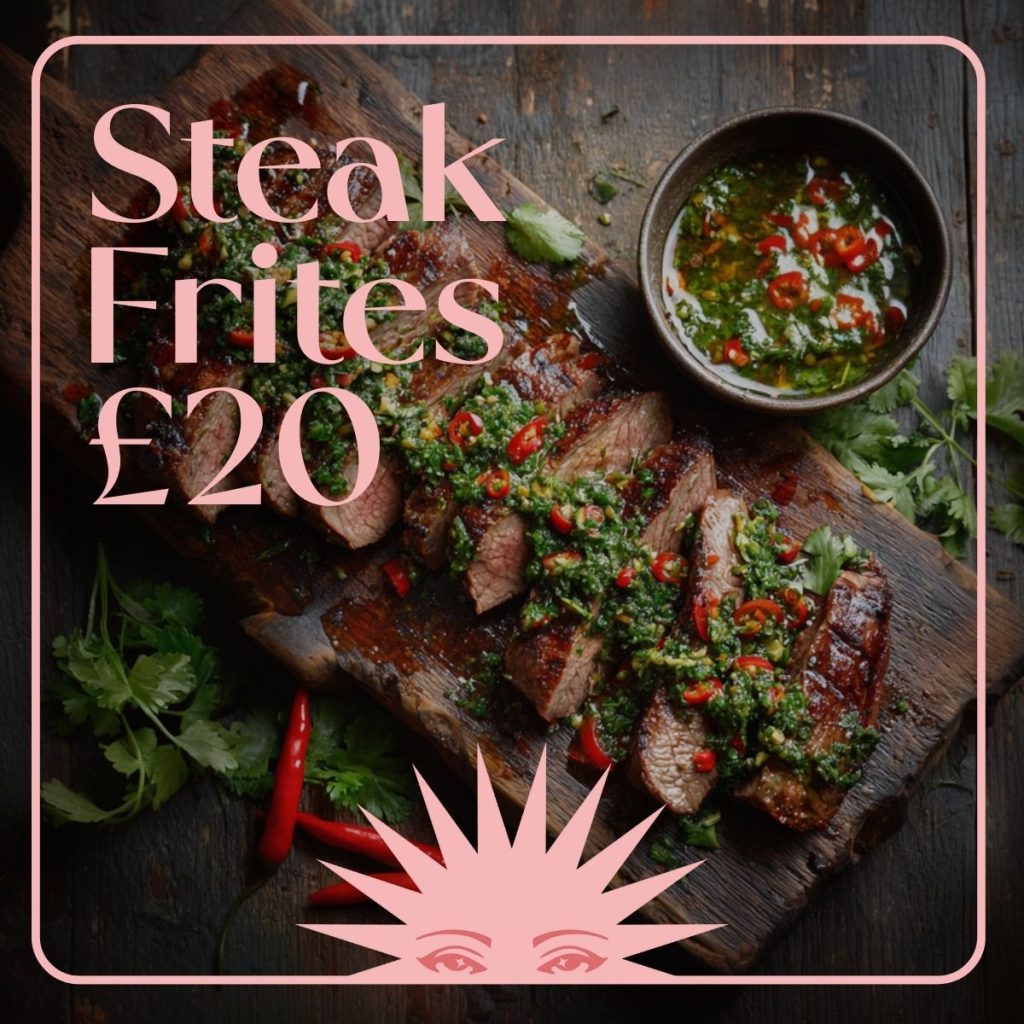 Enjoy a perfectly cooked steak served with chimichurri, fries, and a glass of wine for just £20.
