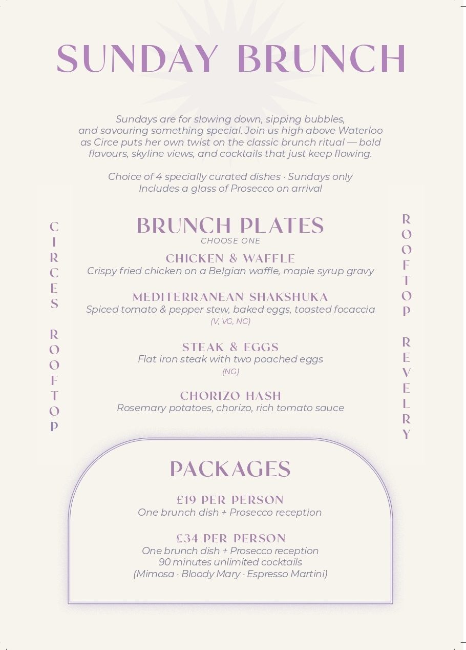 Sundays are for slowing down, sipping bubbles, and soaking up the view. High above Waterloo, Circe reimagines the brunch ritual with bold flavours, flowing cocktails and skyline revelry.